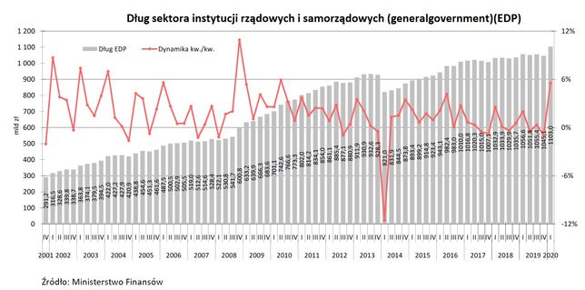 Aby finansować wydatki, państwo może wyemitować obligacje, co zwiększa zadłużenie. W Polsce dług instytucji sektora rządowego i samorządowego (czyli inaczej general government) na koniec 2019 roku wyniósł 1 045,12 mld zł. W ciągu pierwszego kwartału wzrósł do 1103 mld zł, czyli o prawie 58 mld zł.